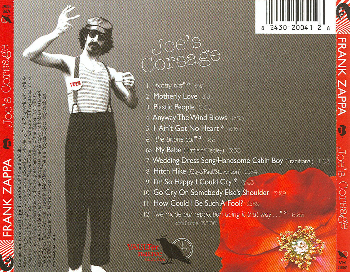 Joe's Corsage contem músicas da época do Mothers of Invention, dos anos 60, antes do lançamento do primeiro álbum "Freak Out" (1966). As músicas foram selecionadas por Joe Travers. Parte das músicas são versões demo de canções que posteriormente fariam parte do álbum Freak Out. A primeira parte de demos, provavelmente gravadas em 1965, tem a guitarra de Henry Vestine, que posteriormente se tornou um membro do Canned Heat. O álbum tem também covers do Righteous Brothers 9My Babe) a de Marvin Gaye (Hitch Hike).