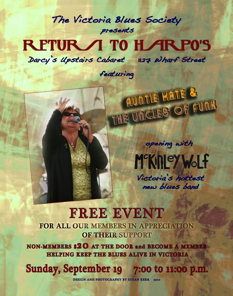 Rising out of the ashes of a west coast R&B band called Club Mongo, a singer, who was to become known as Auntie Kate, and guitarist, Tom Bowler, started a new band. The group formed in 1991 and consisted of Auntie Kate, Tom Bowler, and Clark Brendan. Auntie Kate and the Cheap Suits leaned on the acoustic blues and featured stand bass, accordion, guitar, and of course, flamboyant matching suits. In 1994, a desire to get back to the electric blues, resulted in the dissolution of the Cheap Suits and the formation of Auntie Kate and Small Potatoes. This group was short-lived but was the nucleus of future Auntie Kate endeavours. Former Club Mongo bassist, Doug “Buffalo” Saunders rejoined Kate and Bowler and would remain a member on and off to this day. Joby Baker was the drummer and Tim Boss played B3 organ.