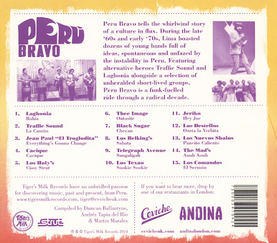 The fifteen tracks on Peru Bravo: Funk, Soul & Psych from Peru's Radical Decade reflect the refractive impact of the global social upheaval of the 1960s and early '70s—including and especially the wild and wooly rock and psychedelic music of the era—on the popular music of Peru, with each track remastered and restored from original tape reels licensed from the original Peruvian labels. (This is the second such compilation of Peru's music from Tiger's Milk Records, following Peru Maravilloso: Vintage Latin, Tropical and Cumbia).