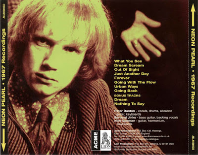 Neon Pearl was a 1960s British psychedelic band consisting of Peter Dunton (vocals/guitar/keyboards/drums), Bernard Jinks (bass guitar/backing vocals) and Nick Spenser (guitar/harmonium/keyboards). They were formed to play as a resident band in a club in Germany, but returned to England in late 1967. In 1967, Neon Pearl recorded a number of studio songs but could not find a record contract. In 2001, Acme released them as the album 1967 Recordings , which is a fine example of experimental British psychedelia with its hazy riffs, mild guitar distortions and vocal harmonies. Dunton was also in the marginally less obscure British psychedelic bands the Flies and Please, while Jinks later played in Bulldog Breed and T2, the latter also including Dunton.